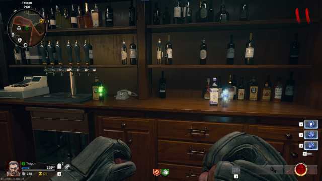 3つのアルコールボトルすべてを収集した後、次のステップはマップの開始場所に戻ることです。居酒屋に入ります。西側にはオープンバーエリアがあります。トレイを見つける必要がある北側に進みます。トレイと武器と対話します。あなたのキャラクターの武器は今消えるはずです、そして、あなたは代わりにあなたの拳を出します。あなたがバーを出るとき、武器があなたに戻ってくるので、それを失うことを心配しないでください。