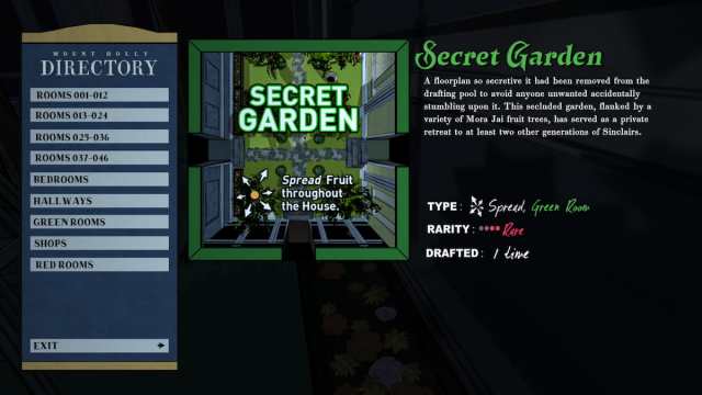 通常のキーとは異なり、シークレットガーデンキーを使用してトランクや通常のドアを開くことはできません。それを使用するには、ロックされた部屋が見つかるまで東部の部屋に向かいます。ドラフトメニューを開けて部屋を選択しようとすると、果物が広がった珍しい緑の部屋である秘密のガーデンルームが得られます。それを選択すると、ここで秘密の庭のキーを使用してドアを開けてエリアに入ることができます。ここでは通常のキーを使用することはできません。そのため、特別なキーがない場合は、ランニングでデッドエンドになるため、ドラフトしないでください。