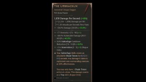 上の画像では、Umbracruxユニークなアイテムの最大統計値を見ることができます。これらの統計のほとんどは、ベースの統計から多くのダメージを失うため、武器のアイテムの電源が925でないかどうかは関係ありません。約925アイテムのパワーumbracruxを取得したら、潜水式CDR統計を最大化します。