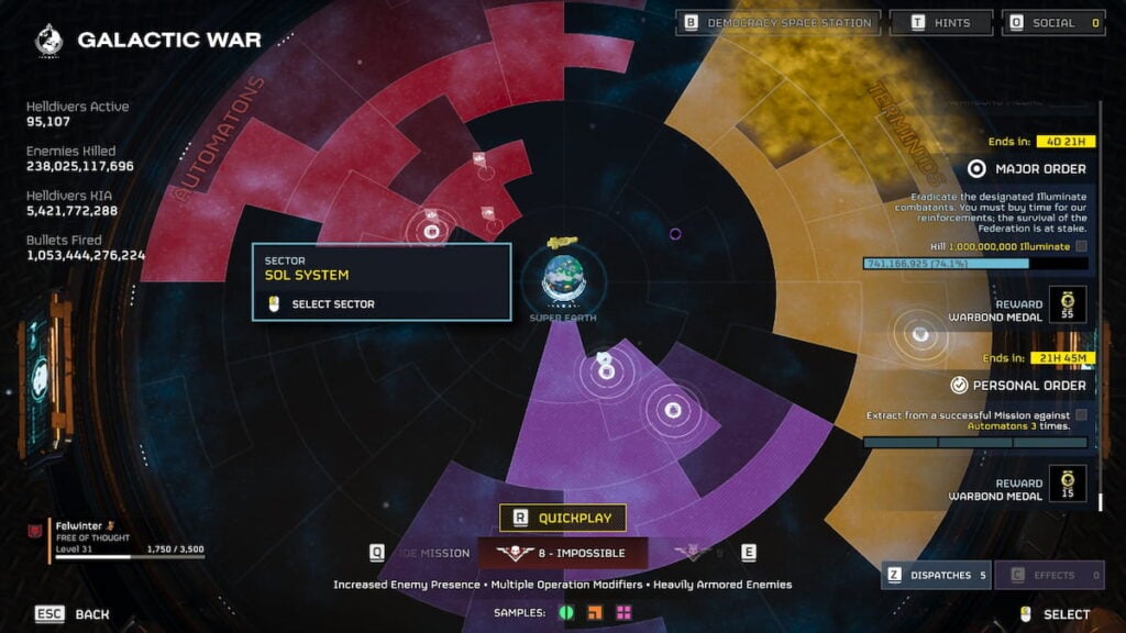 難易度が高いほど、報酬は良くなりますより短いミッションで構成されるより難しい操作を探してください、オートマトンの力を根絶するように。これは、Helldivers 2でウォーボンドメダルを農業するための最良の方法です。