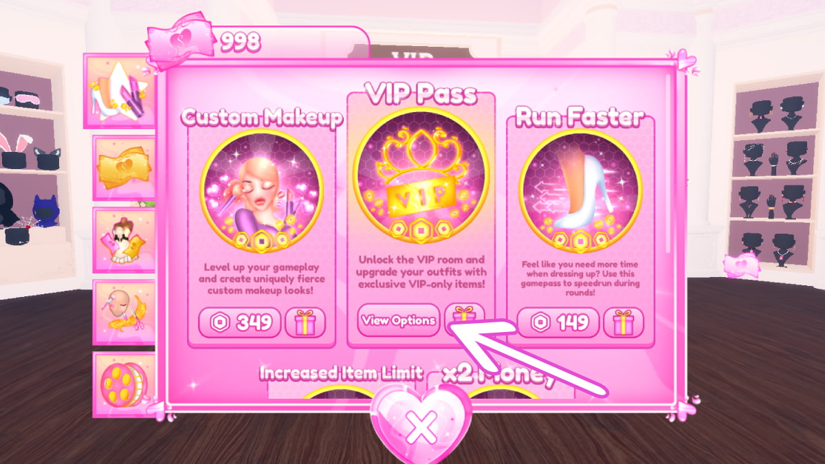 誰かにVIPを贈るために、そのプレーヤーは同じでなければなりません感動するドレスあなたのようなサーバー。をクリックしますゴールデンヒールと口紅のアイコン店を開く左に。ショップの中心には、VIPパスのオファーが表示されます。クリックしてください「オプションの表示」。