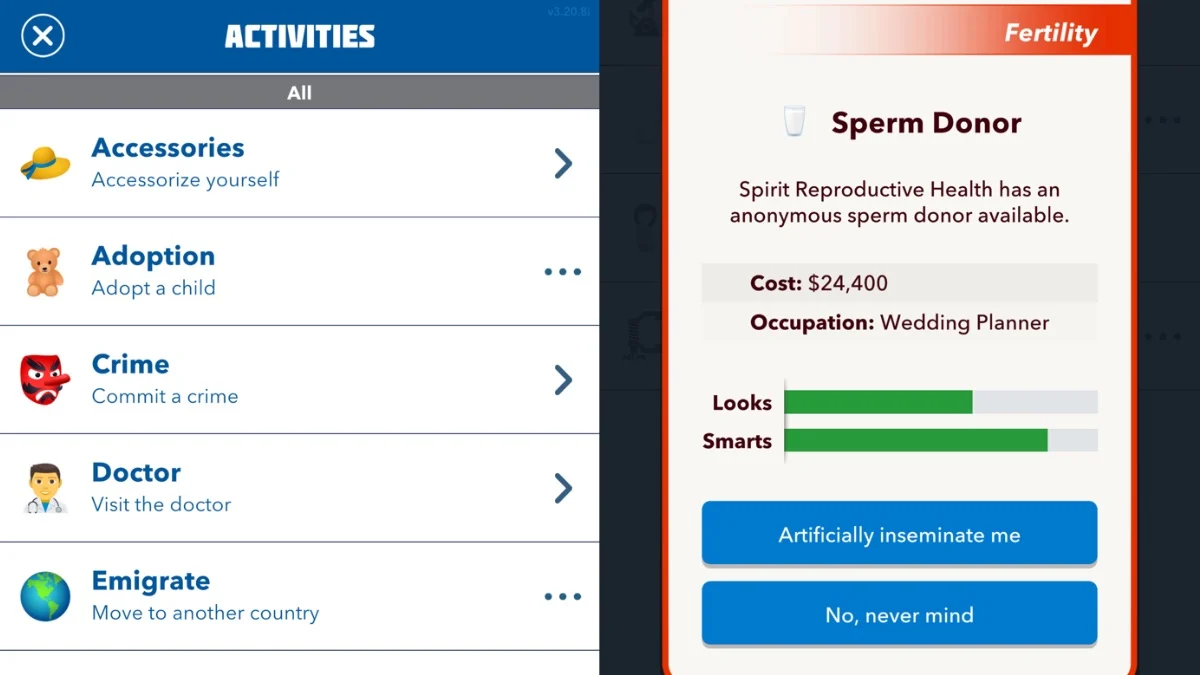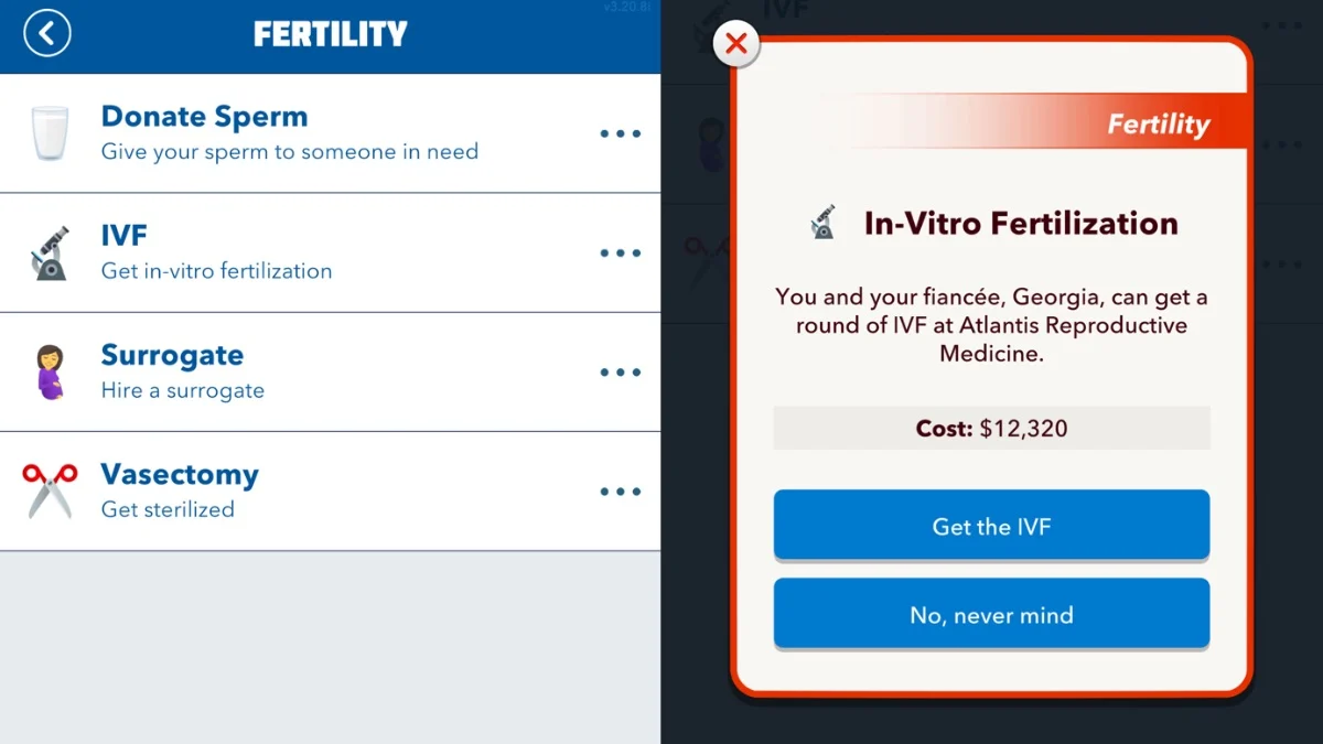 IVFを取得するか、人為的な授精を試すには、アクティビティ> Fertility>に移動し、お好みの方法を選択してください。 IVFは最も高価なルートですが、最も可能性が高いです。それは常にうまくいくとは限りません、あなたに双子を与えることは言うまでもありません。ただし、複数の1泊スタンドを持つよりも、それはより良いチャンスです。