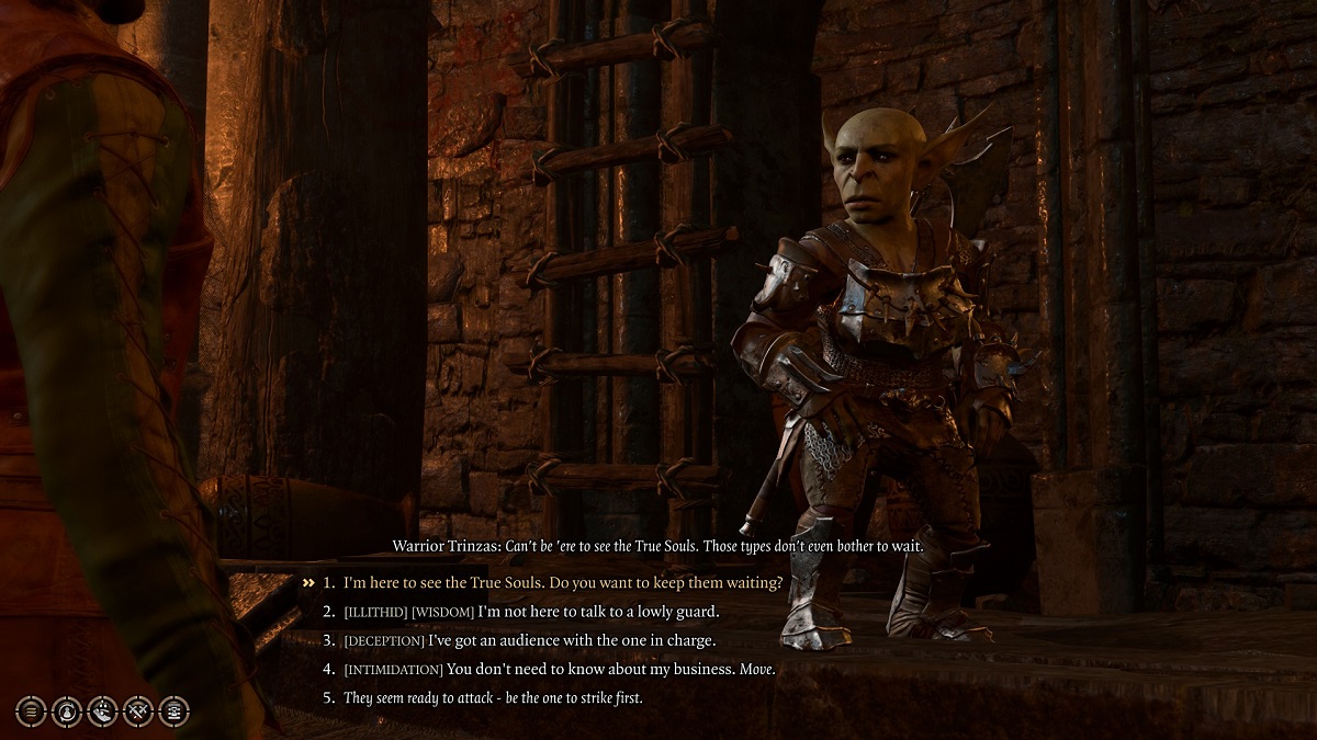 ゴブリンの刑務所に入ると、セキュリティによって正門に停車します。 Warrior Trinzasはあなたの意図が何であるかを尋ねます。これに取り組む方法は複数あります。魔法のクラスとして、私は彼女の心を覗き込むことができました。インテリジェンスチェックがありますが、特に出会いの直前に手動で保存する場合は、かなり簡単に打ち負かすことができます。あなたがロールを失った場合、彼らはすべてあなたを攻撃します。あなたが成功すると、彼女は彼らの基地に集まった真の魂についてあなたに話すでしょう。