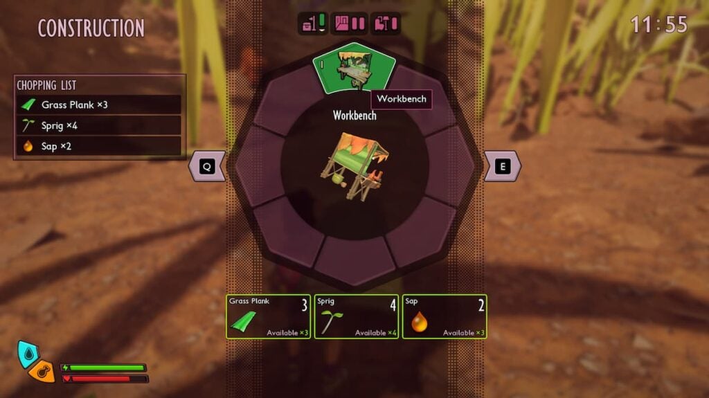 SAPとSPRIGは、草の板とは異なり、在庫に保管できます。十分な樹液と小枝があることを確認しながら、ワークベンチを構築する場所に3つの草の板を運び、ビルドメニューを持ち出し、ワークベンチアイコンを選択して、[場所]を選択します。配置したら、透明なワークベンチの近くに行き、ビルドを選択します。
