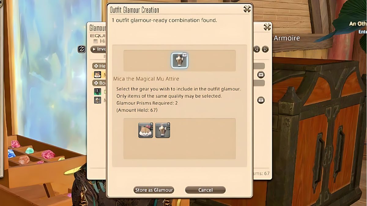 衣装の魅力の下に保管されているアイテムで魅力を作ることは、以前とまったく同じであり、アイテムは以前の場所に常にあるように表示されます。唯一の違いは、アイテムの上にホバリングするときにポップアップする窓に小さなメモであり、衣装の魅力の一部として保存されていると述べています。