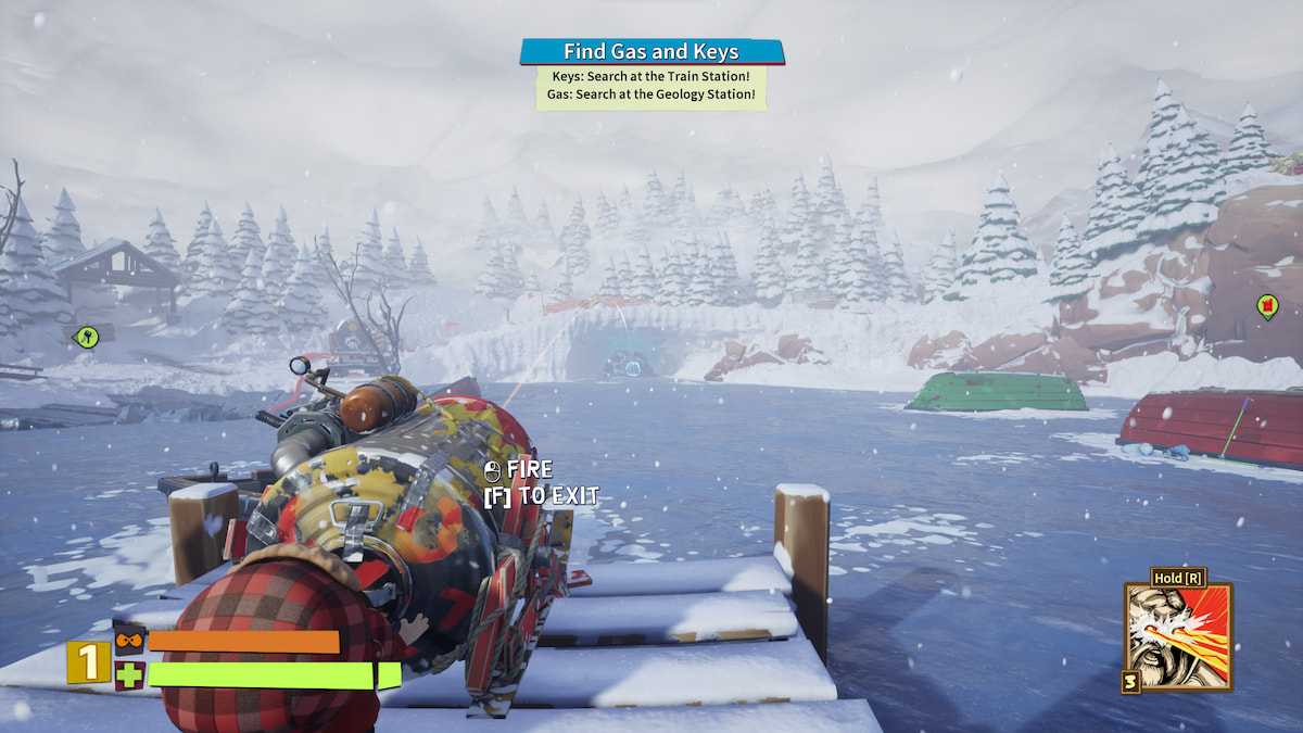 大砲を大砲に積み込んだら、それを使用して氷を壊して宝物を取り戻すことができます。インタラクションボタンを再度押して大砲に飛び乗ります(fまたはd-padダウン)。