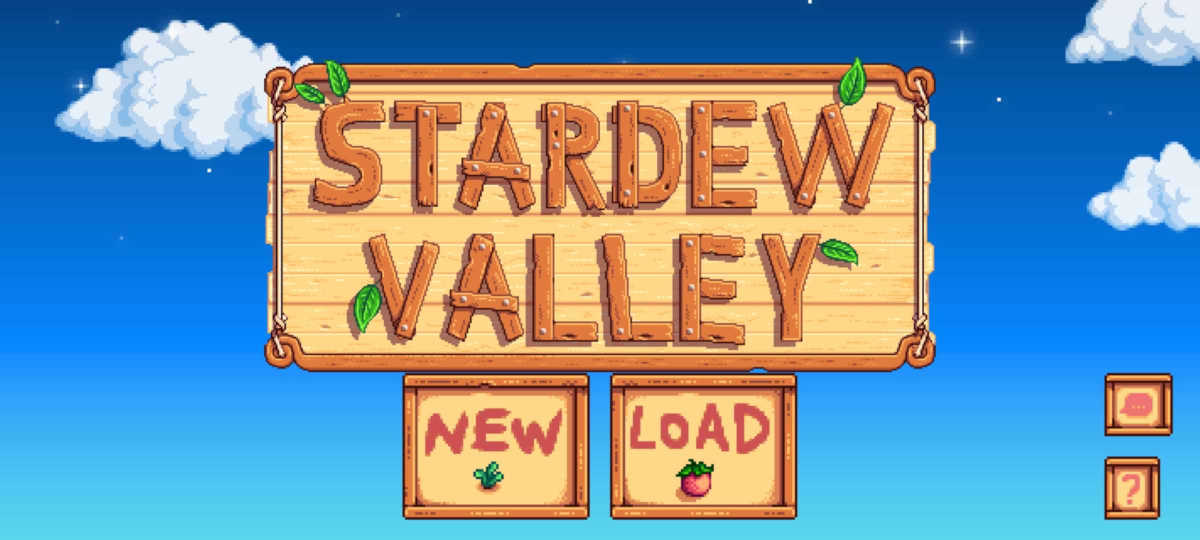 最初に携帯電話やタブレットでStardew Valleyを開くと、ロゴと同じ古いメニュー画面と、新しいゲームを開始するか、下部にゲームをロードするオプションが表示されます。ロゴを詳しく見て、4セットの葉に注意してください。以下に示すように、葉の各セットは方向に対応しています。