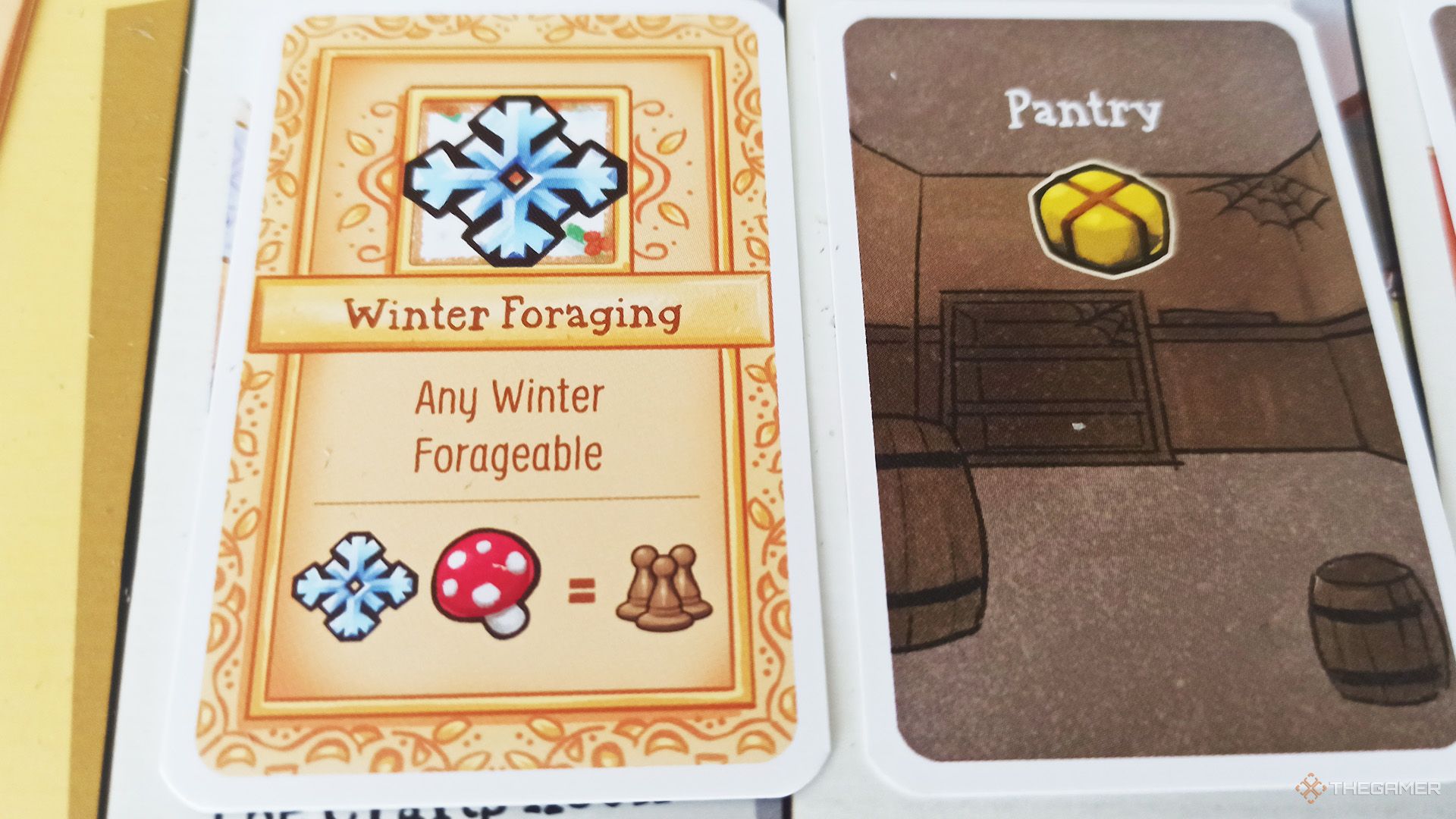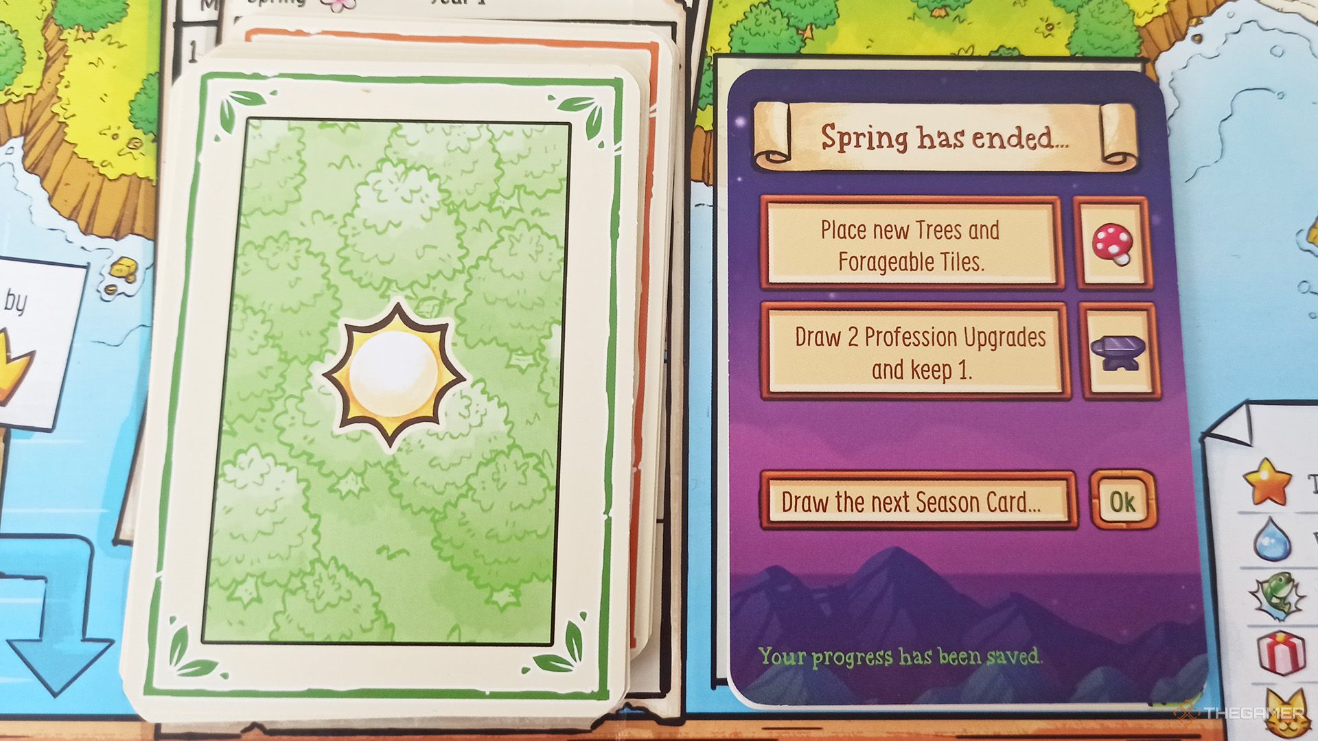 シーズンエンドカードが描かれたら、必要ですボードからすべてのforageableおよびツリータイルを削除しますそして、次のシーズンに適切なタイルを指定されたスポットに配置します。その後、各プレイヤーは2つの職業アップグレードを描きます彼らの職業に一致するカードとできるカードそれらの1つを保管してください。
