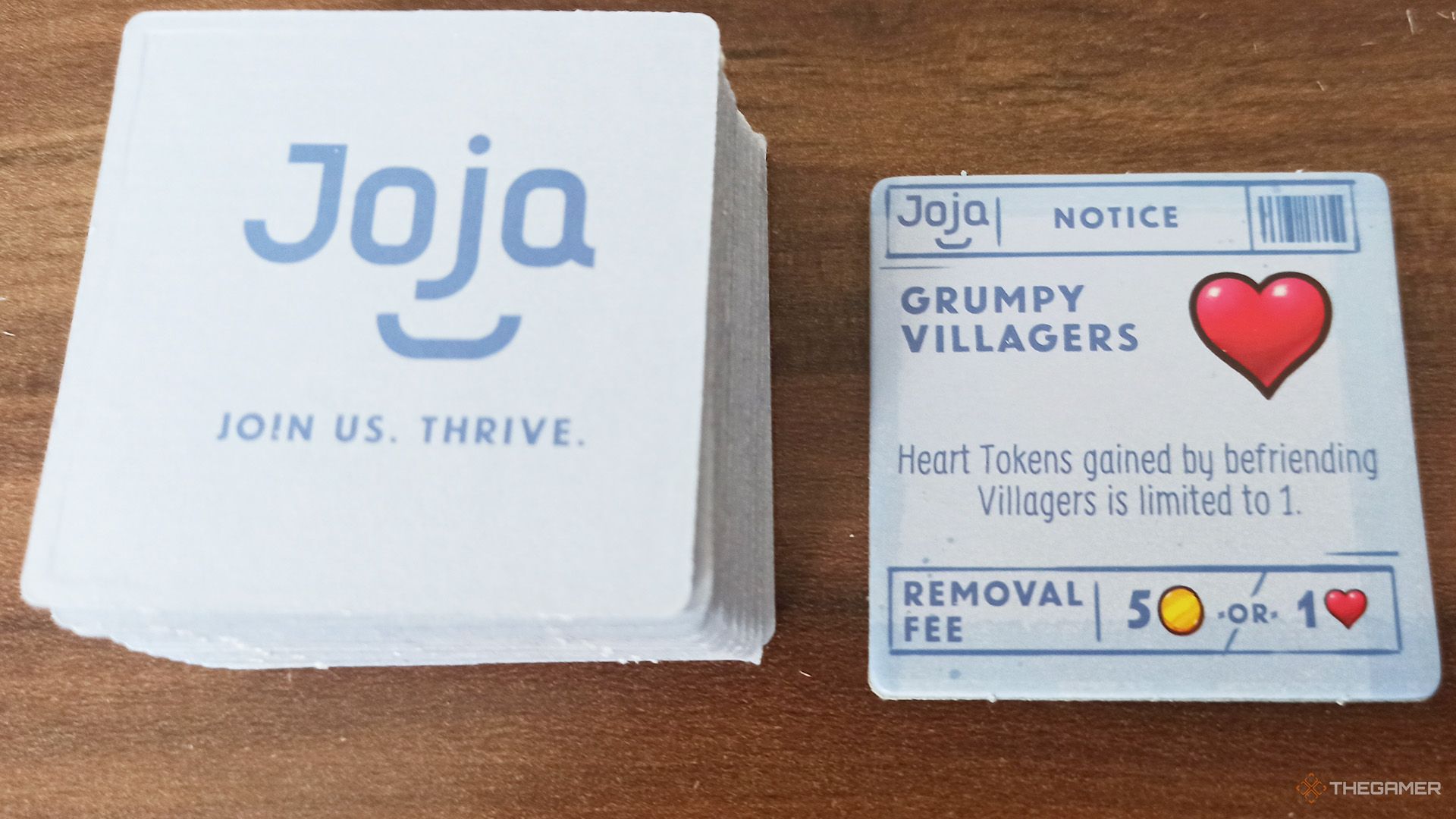シーズンカードに表示されるJojaタイルは、ゲームをより困難にし、制限を課します。それらを配置するには、最上部のJojaタイルを選択し、リマインダーとしてシンボルで示されるように、対応する領域に配置します。それらを廃棄するには、ターンエフェクトの終わりを使用する必要があり、それらを破棄するには、1つの心臓トークンまたは5つの金のいずれかが必要です。