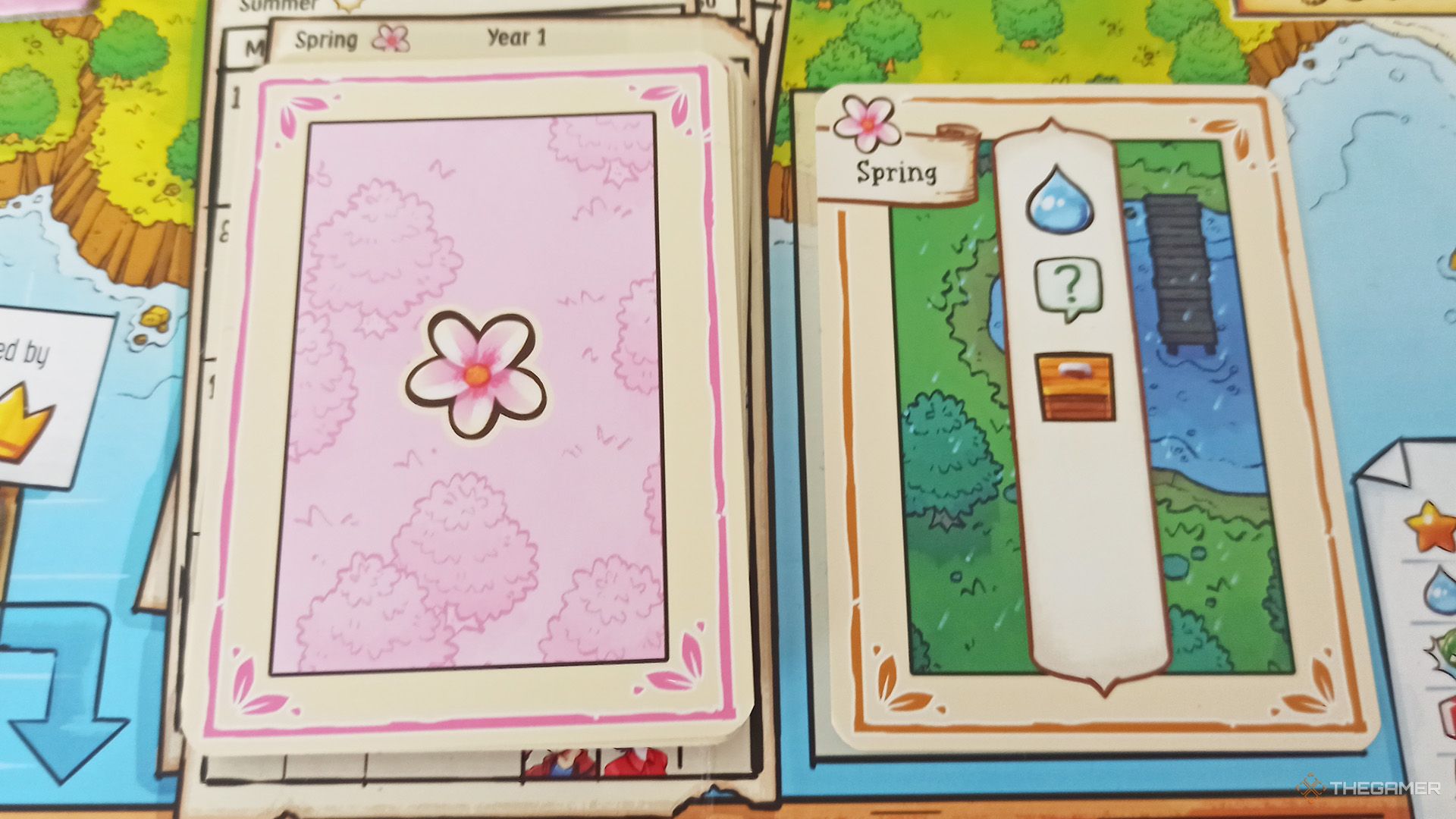 forageableおよびツリータイルは季節ごとに色分けされています。セットアップにはスプリングタイル(ピンクの背景)のみを使用します。それらをシャッフルします各採餌スポットに1つの対面タイルをランダムに配置します(合計11)。ツリータイルの場合、スプリングタイルをシャッフルしますランダムに葉を上に置きますボード上のすべてのツリースポットに。後で使用するために残りのタイルを脇に置いてください。
