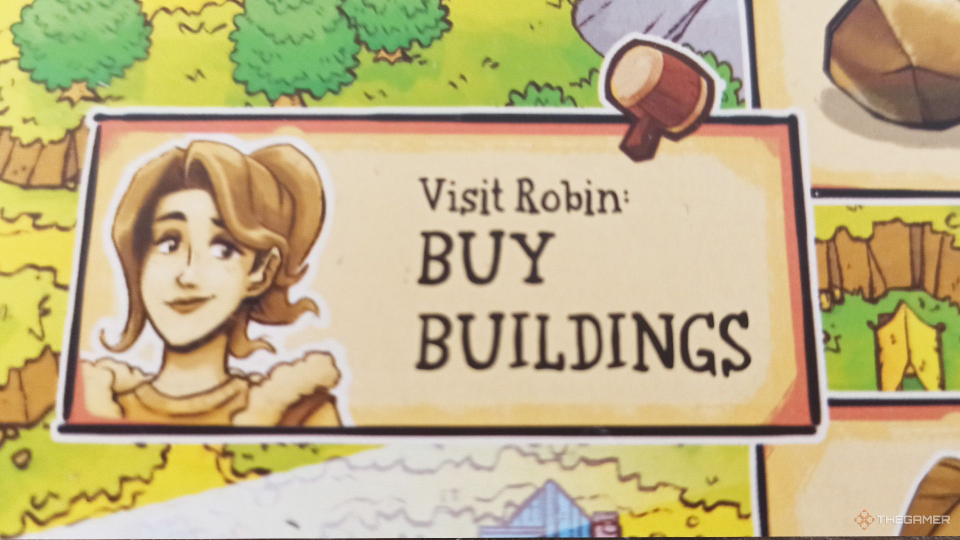 ロビンにアクセスして建物のタイルを購入するためのアクションを費やしてください。ただし、これらの建物タイル木、石、金が必要です。購入したい建物のタイルに必要なリソースを廃棄し、建物を取ります。建物はそうですいずれかのプレイヤーが所有していませんすべてのプレイヤーの間で共有されます。建物を購入した後、その効果をアクティブにする必要があります。