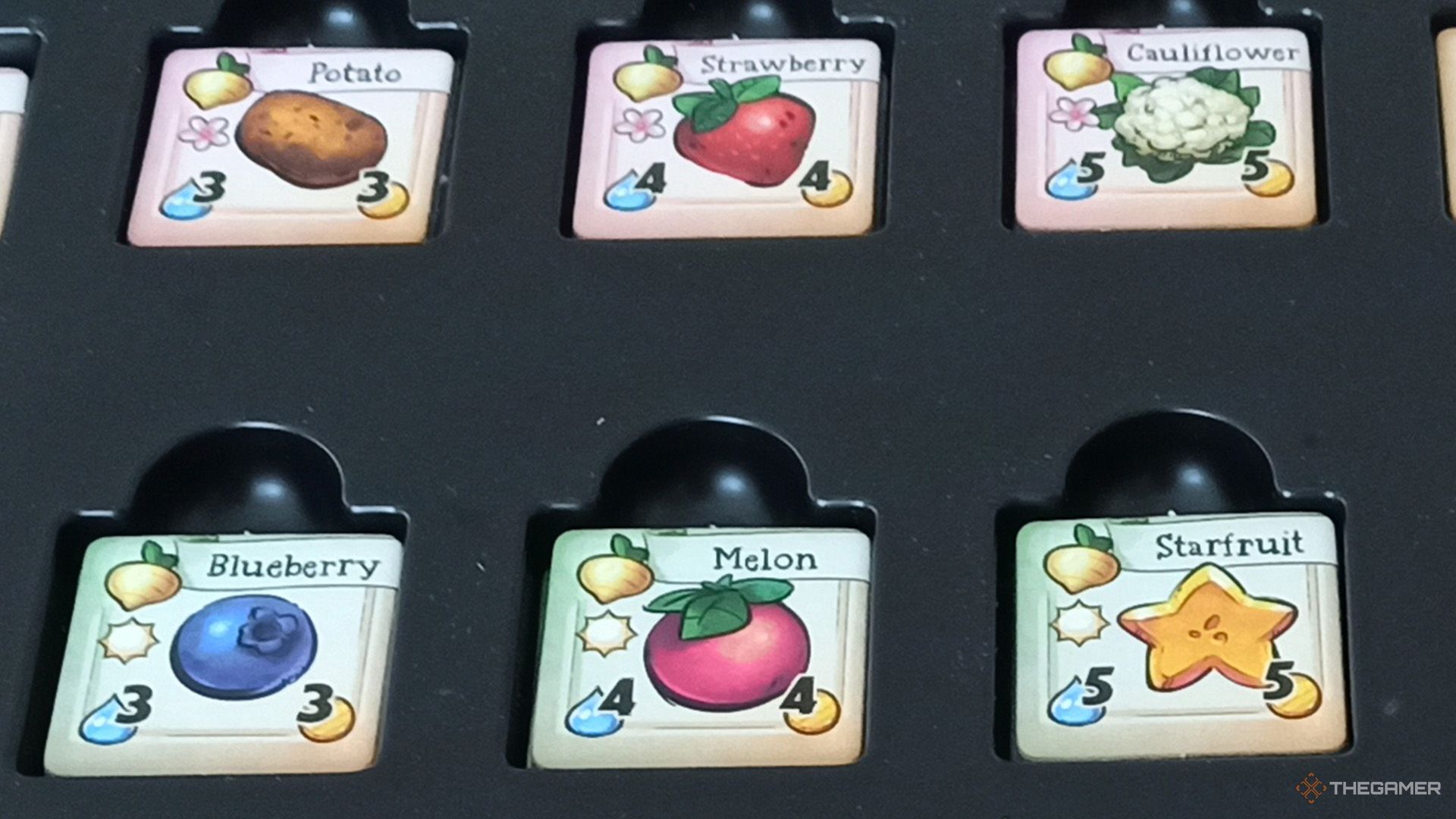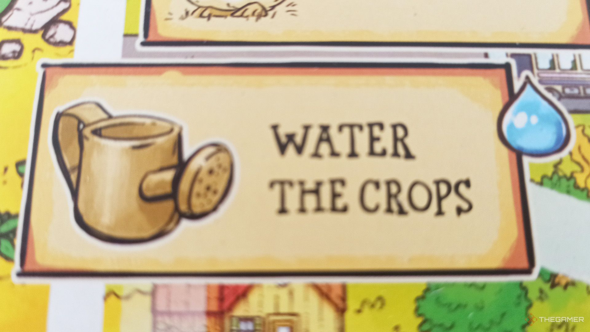 種子を購入するか、リソースを販売するために1つのアクションを費やしてください。これは、1つのアクションで希望するだけ何度も行うことができます。あなたが購入する種はそうです現在のシーズンに基づいています、そしてあなたがそれらを取得するとすぐに、それらはあなたの牧場の下のスロットの1つに配置されます。シードカードの左下隅にある水のアイコンどのスロットを配置するかを示します。