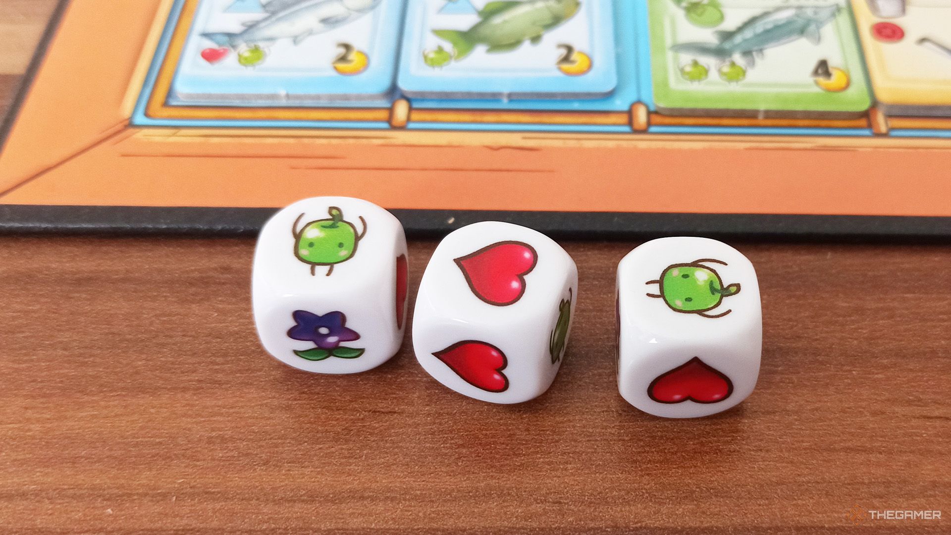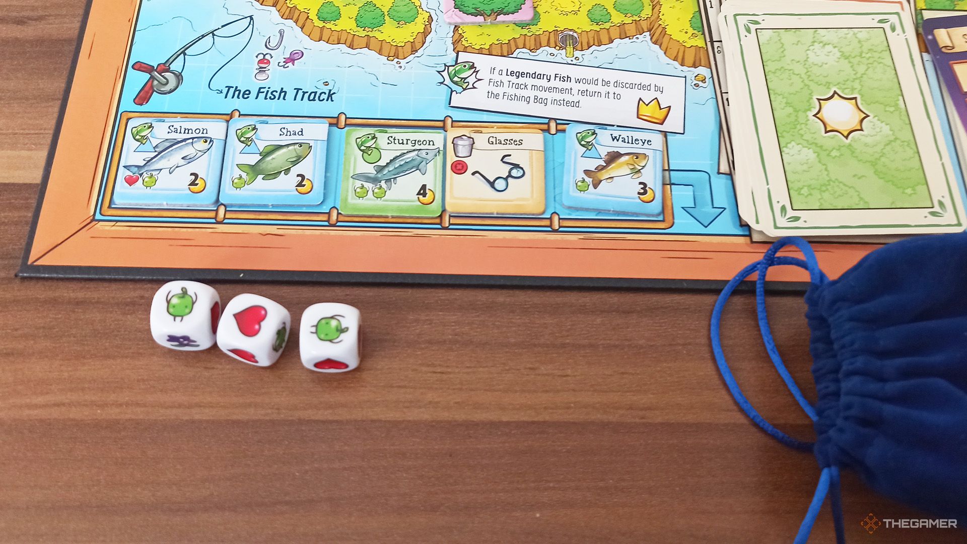 魚を捕まえるために、スターデューサイコロ3個をロールします。サイコロのシンボルを使って、あなたがいるエリアから1匹以上の魚を捕まえるために費やすことができます。各シンボルを1匹の魚に費やします。