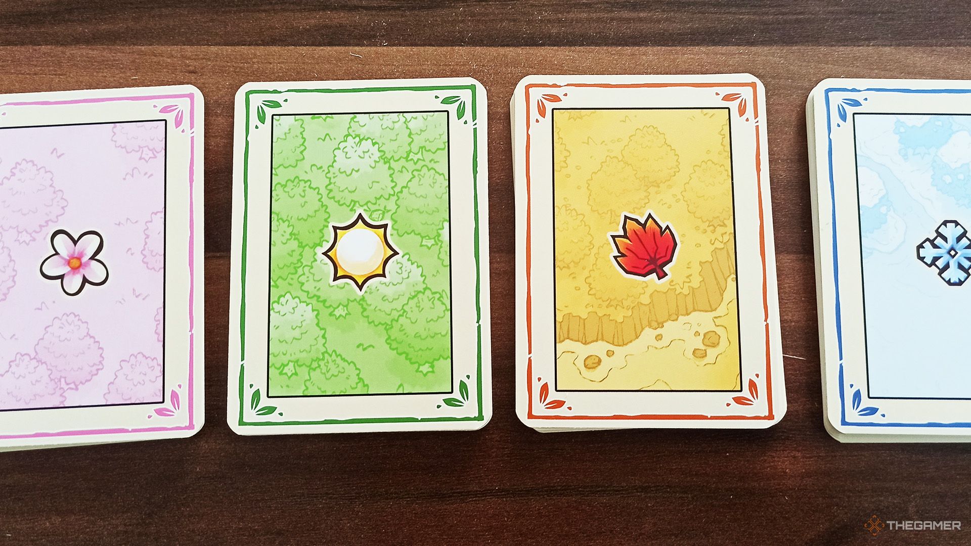 今、シーズンデッキを構築して配置しますボードの下部にある指定されたエリアで対向。これが最初のゲームである場合は、16の標準シーズンカードを使用して、シーズンごとに4つの別々のフェイスタウンパイルを作成します。