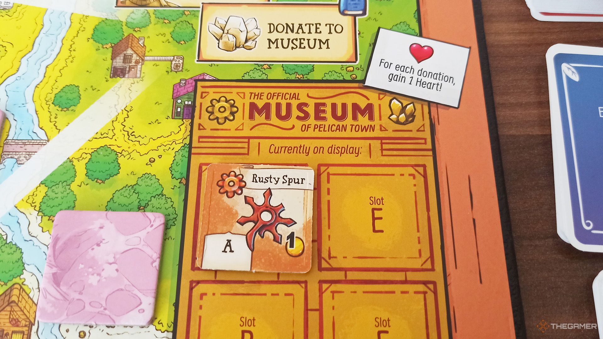 Guntherにアクセスしてください持っているアーティファクトや鉱物を寄付します。これらの多くを好きなだけ寄付するためのアクションを費やしてください。寄付された各リソースタイルハートトークンを1つ獲得してください。寄付されたリソースは、8つのスロットがある博物館に配置する必要があります。