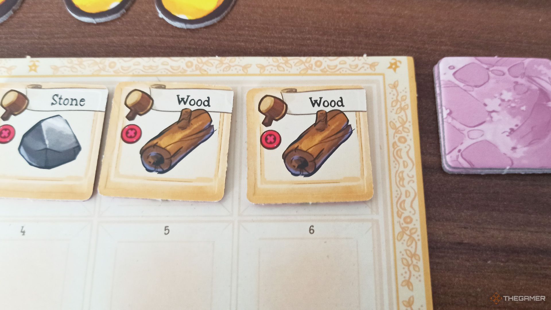 forageableタイルから、1つのパースニップタイル(ピンクの背景)を取り、農家のイラストの下の2番目のスロットにそれを置きますボード上。通常の側面を上にして置きます(質の高い面ではありません)。