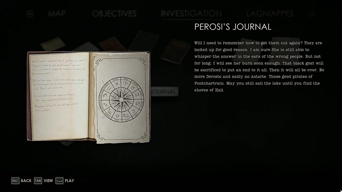 まず、待機ホールに行き、バティストの鍵で管理を解除します。内部では、右側の机の上のペロシのキーを拾います。次に、時計に戻り、ホールを下って左に行きます。ペロシの部屋は#6で、左側の最後のドアです。内部では、ベッドから紙と角のソファから日記をつかみます。