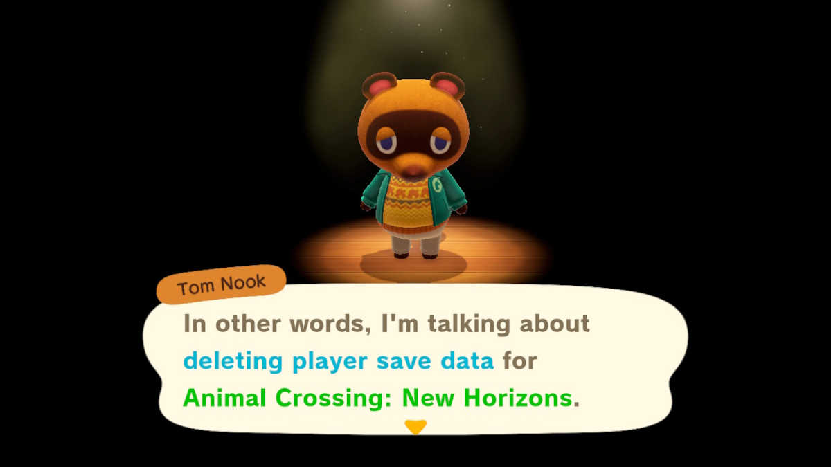 任意の時点で島に複数のプレイヤーが登録されていて、保存データだけを削除したい場合は、動物の交差点であるNew Horizonsを通じてそれを行うことができます。これは完全なリセットではありませんが、単一のプレイヤーに関連するすべてを取り除きます。プレイ中に彼らが獲得したお金やマイルは削除され、彼らの家も消えます。島で作られたバックアップも削除されます。