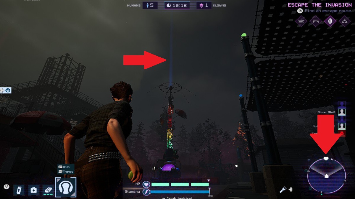 復活タワーを見つける最初の方法は、画面の右下隅にあるミニマップのハート型アイコンに従うことです。カーソルがハートアイコンに面しているまで回し、その方向に向かって進み始めます。ハートアイコンに向かうときは、空を貫通する青いレーザービームに注目してください。マシンの上部から発せられるこのビームは、ビーコンとして機能し、その場所に近づくように導きます。この視覚的なキューをハートアイコンと並行して使用して、マップをナビゲートします(両方とも上の写真でマークされています)。