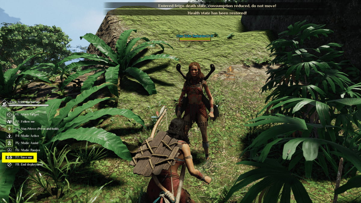 部族のマンを展開したら、押します私を救ってください左側のオプションのリストからキー、それはF7。彼らはすぐにあなたに走り、あなたを死から救います。彼らがあなたからそれほど遠くない場合、またはあなたがより多くの健康を排出することを避けるためにあなたに連絡できるまであなたが装って死にとどまるならば、これは最適に機能します。