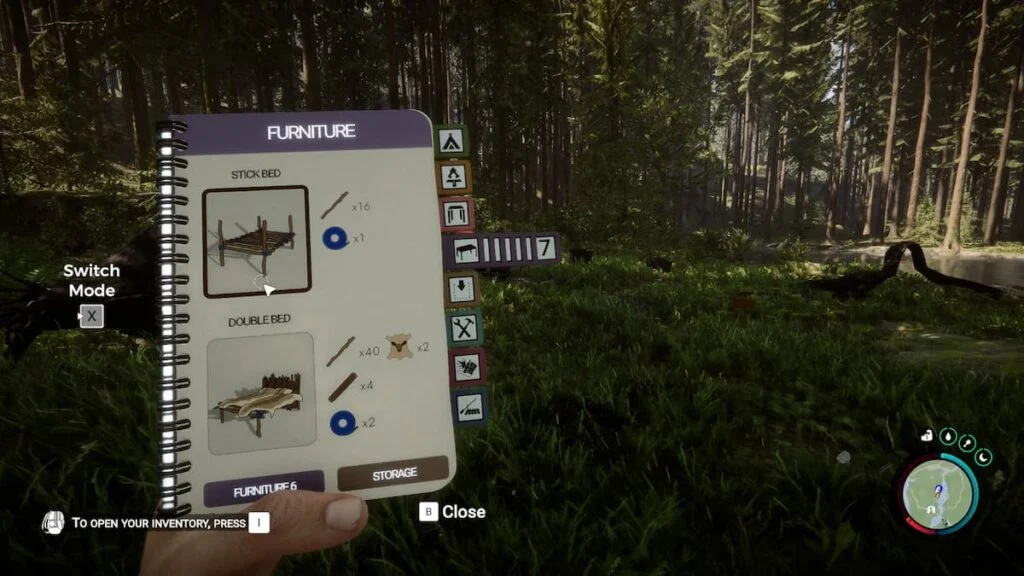 ロッジのようなより大きなものを建てることに決めた場合、ベッドも必要です。基本的なスティックベッドは、ハンドブックの家具カテゴリの7番目のページ(左モード)にあります。 16個のスティックと1個のダクトテープが必要です。青写真を家の中に置いて完成させます。