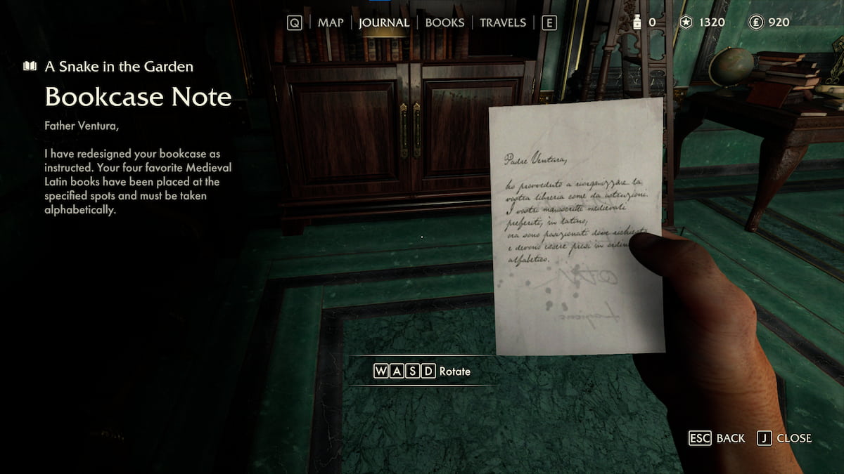 この場所に着くときは、そうするだけですVenturaの机から1つのメモを固定する:本棚のメモ。これは、本棚を設定した人がそれをどのように再設計し、4つのお気に入りの中世ラテンの本が特定の場所に置かれたようにしていることを詳述し、それらをアルファベット順に取る必要があります。インディアナジョーンズのミステリーに期待されるように、正しい本を本棚から適切な順序で引っ張る必要があります。
