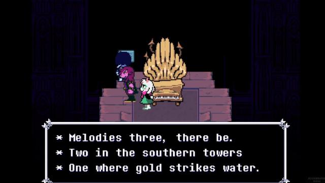 ゴールデンピアノのすぐ隣にある3つのゴールデンピアノノートの場所についてのヒントを見つけることができます。それを調べてください、そしてそれはあなたに「3つのメロディー、ある」と言います。サザンタワーに2つ。金が水を打つもの。」