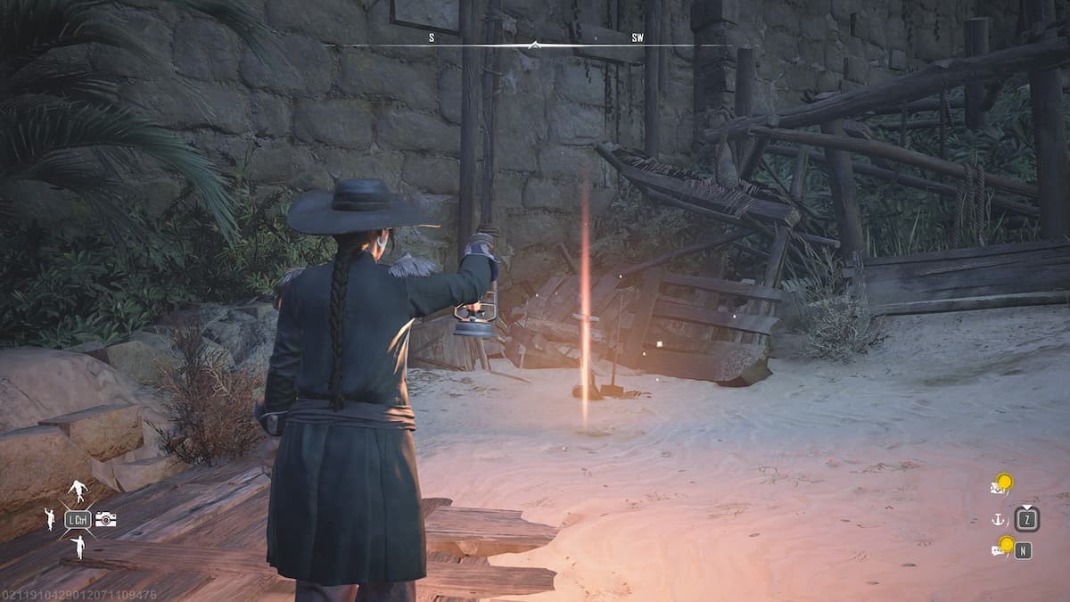 着陸したら、ファラの和解に入ります。左側にオレンジ色の輝きがあり、宝物が埋められている場所を意味します。私が来た角度は、私がその場所を見つけたことを示すクロス、シャベル、帽子を隠しました。その場所を掘って海の人々の遺物を明らかにします。