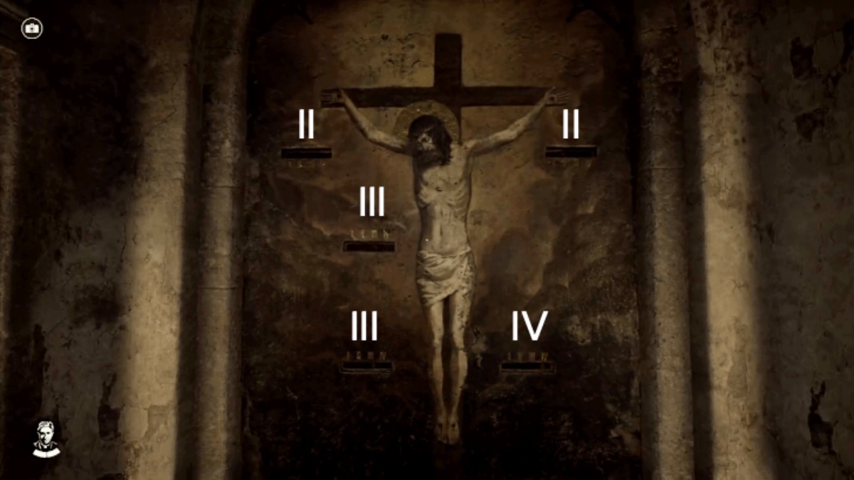 隣の部屋では、部屋の端に盆地がある彼の体のさまざまなポイントと他の壁画の異なるポイントでローマの数字を持つ十字架上のイエスの姿を見るでしょう。あなたの最初の手がかりを得るために、イエスの壁画の写真を撮ってください。次に、十字架上のイエスの前の盆地にワインを注ぎ、両手、足、そして彼の側でハンドルを明らかにします。