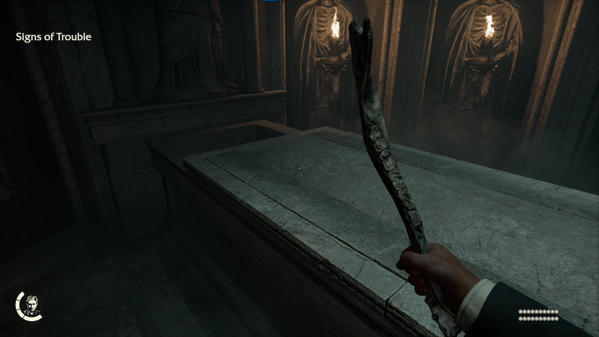このパズルは、地下世界の隅にある場所で、地下室に入った直後に見つけることができ、神聖な傷のパズルを完成させました。これはオプションのパズルであるため、マップの隅で見逃すのは簡単です。部屋に入ると、単一の石coを囲むいくつかのスケルトン像があり、特定の彫像の火山を照らすためにそれを開く必要があります。