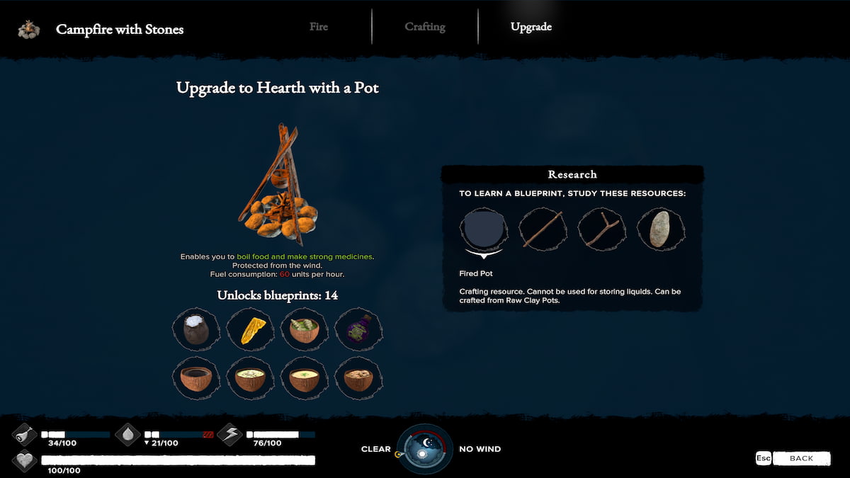 現在配置しているキャンプファイヤーに応じて、いくつかの異なる素材でアップグレードできます。通常のキャンプファイヤーは石のあるキャンプファイヤーにアップグレードし、石のあるキャンプファイヤーは鍋で炉。ただし、アップグレードの青写真を学ぶには、アップグレードビルドに必要なすべての資料を発見する必要があります。それは、アイテムのクラフトレシピを持っているか、島でそれを見つけることを意味します。炉のアップグレードに必要なものは次のとおりです。