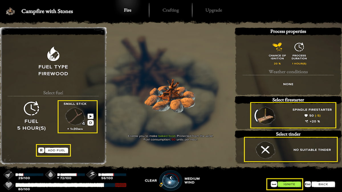 点灯する準備ができたら、火に近づき、点火プロセスを開始します。メニューでは、燃料、Firestarter、および可能なTinderを追加する必要があります(ただし、Tinderはオプションです)。
