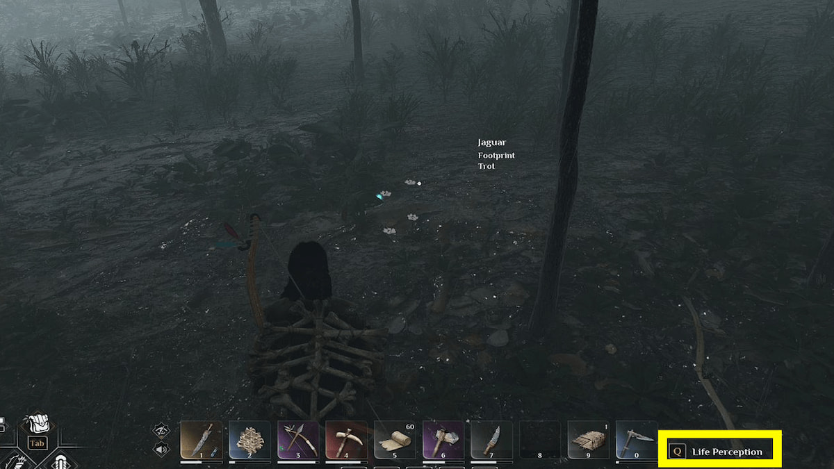 そこに着いたら、ライフ認識ボタン(Q)を押すことで、習慣分析を適切に使用することができます。このボタンを押して、トラックの検出を開始すると、地面を見下ろしてください。それらは青で強調表示されます。あなたは彼らに近づいて、動物がそれらを残したものと彼らがどのような速度を入力していたかを見ることができます。