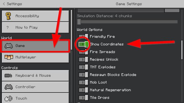 Minecraft Bedrock Editionでは、[設定]メニュー使用します座標を表示しますオプション。これは、場所の座標を取得する方法です(上の画像を参照)。