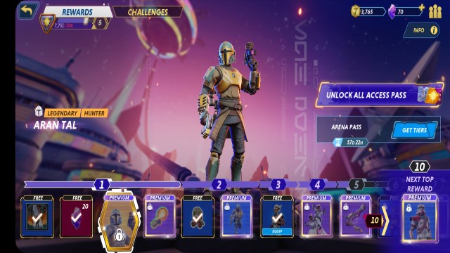 現在のプレミアムアリーナパスは、Aran TAへのインスタントアクセスを提供しますL、マンダロリアンハンター。すべての新しいアリーナパスがこのように新しいハンターを特徴とするかどうかは不明であり、アリーナパスが終了するとハンターのパスでアランタルが無料で利用できるかどうかも不明です。