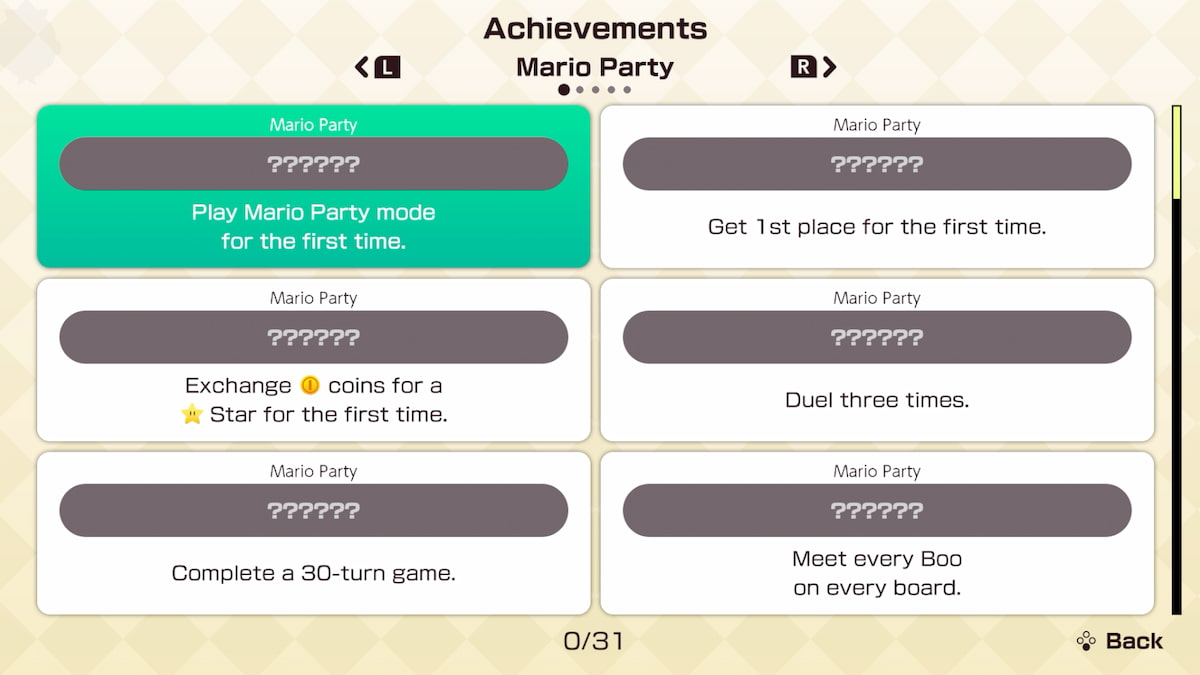 これらの成果のいくつかは、他の成果よりもかなり簡単です。スーパーマリオパーティーのジャンボリーゲームを通過するたびに一握りのロックを解除することを期待できますが、時間が経つにつれて、それらははるかに複雑になります。たとえば、そうかもしれません他のプレイヤーと少なくとも3回、またはすべてのボード上のすべてのブーイングに対して決闘する必要があります。これをどのように進めるかは完全に透明ですが、友人とまたはAIに対して一握りのゲームをプレイすることは、彼らの多くを介して作業するための優れた方法です。これらの成果の多くは、ゲームのプレイに集中することを奨励しています。