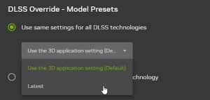 - 選択する「最新" 下 "すべてのDLSSテクノロジーに同じ設定を使用します「