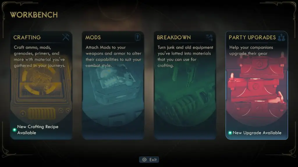 Companion Mod Kit を入手したら、作業台そして、パーティーのアップグレードオプション。ここでは上記のような画面が表示され、ロックを解除するアップグレードを選択できます。これらは変更できないため、慎重に選択してください。