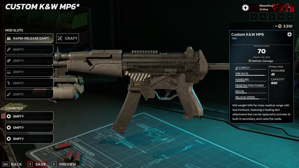 MODを作成したら、目的のMODを適用できます(単一の部品の複数のオプションを作成した場合)。次に、名前を適用してカスタムロードアウトを保存する必要があります。武器を保存すると、Doshの修正コストを確認できます。カスタマイズされた武器は、バニラのカウンターパートよりも常に費用がかかりますが、はるかに効果的になります。