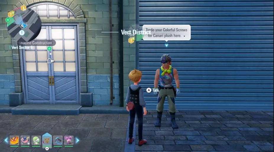 カラフルなネジは、ルミオーズシティの南東、ワイルドゾーン 17 の東にあるラシーン建設の前で、閉じた大きな門の前にいる黄色いスカーフをかぶった建設作業員に話しかけることで交換できます。彼に近づくと、「ここでカラフルなネジをカナリのぬいぐるみと交換してください」と言っているのが見えます。