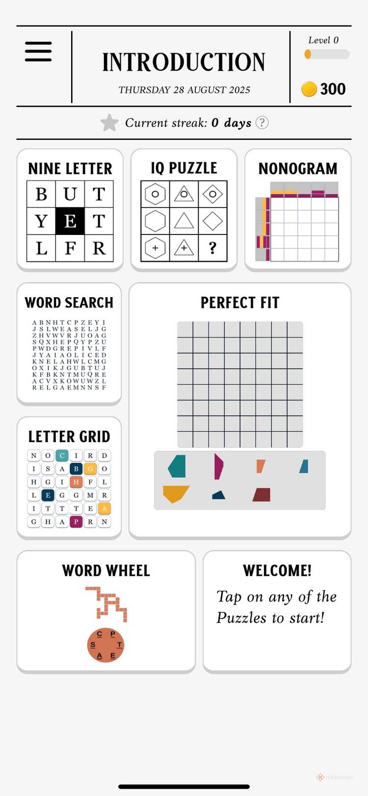 9文字、IQパズル、ノングラム、ワード検索、文字グリッド、完璧なフィット、ワードホイールの合計7つのゲームを提供します。