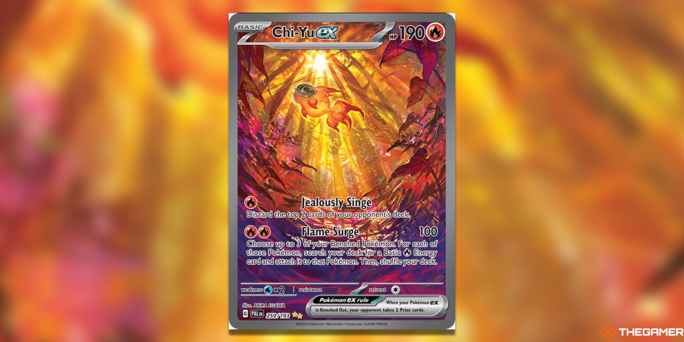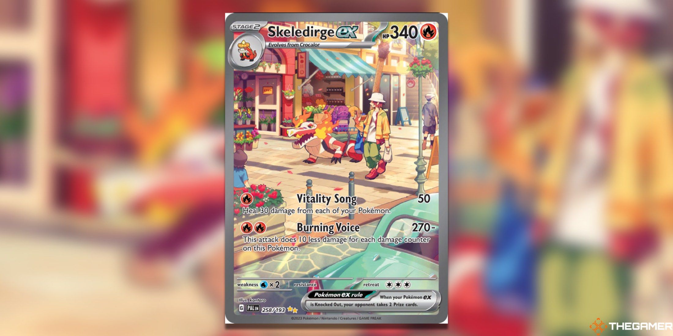 Fuecocoの印象的なショーにもかかわらず、それは私たちがすでに確立したスターターの階層に沿って、Meowscaradaの事前に進化した形であるSprigatitoに敗れます。スタイルはフエココとは異なりますが、このカードは同様に明るく、自然照明に合わせて赤と緑の美しい色合いがあります。