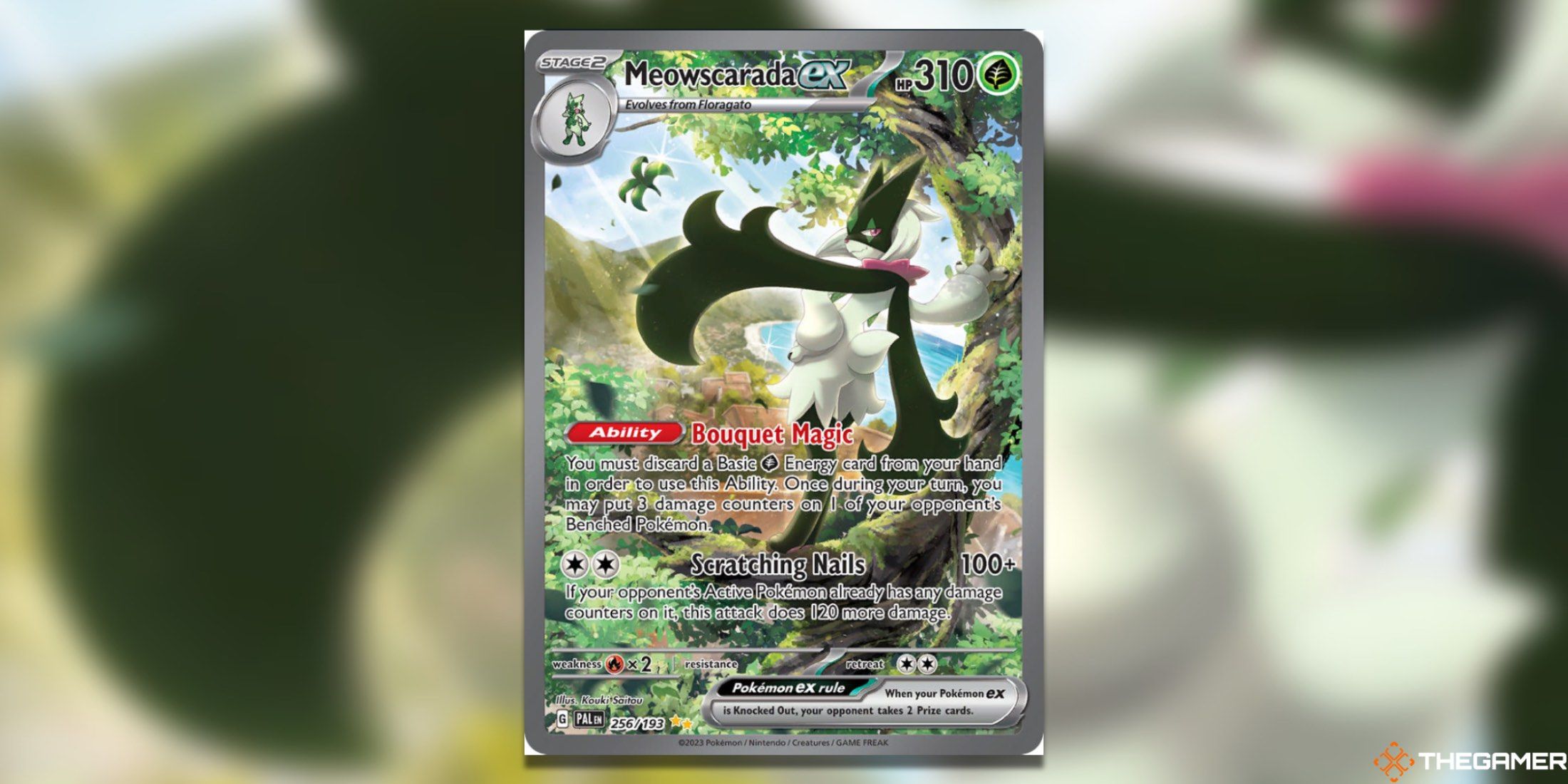 MeowscaradaはSkeledirgeと並んで立っており、この世代の最も価値のある最終進化のスターターとして熱く争われた場所を主張しています。このMeowscarada Exは、Paldeaが進化した最も価値のあるカードの1つであり、その人気が高まっているおかげで、すぐにその区別をあきらめることはありません。