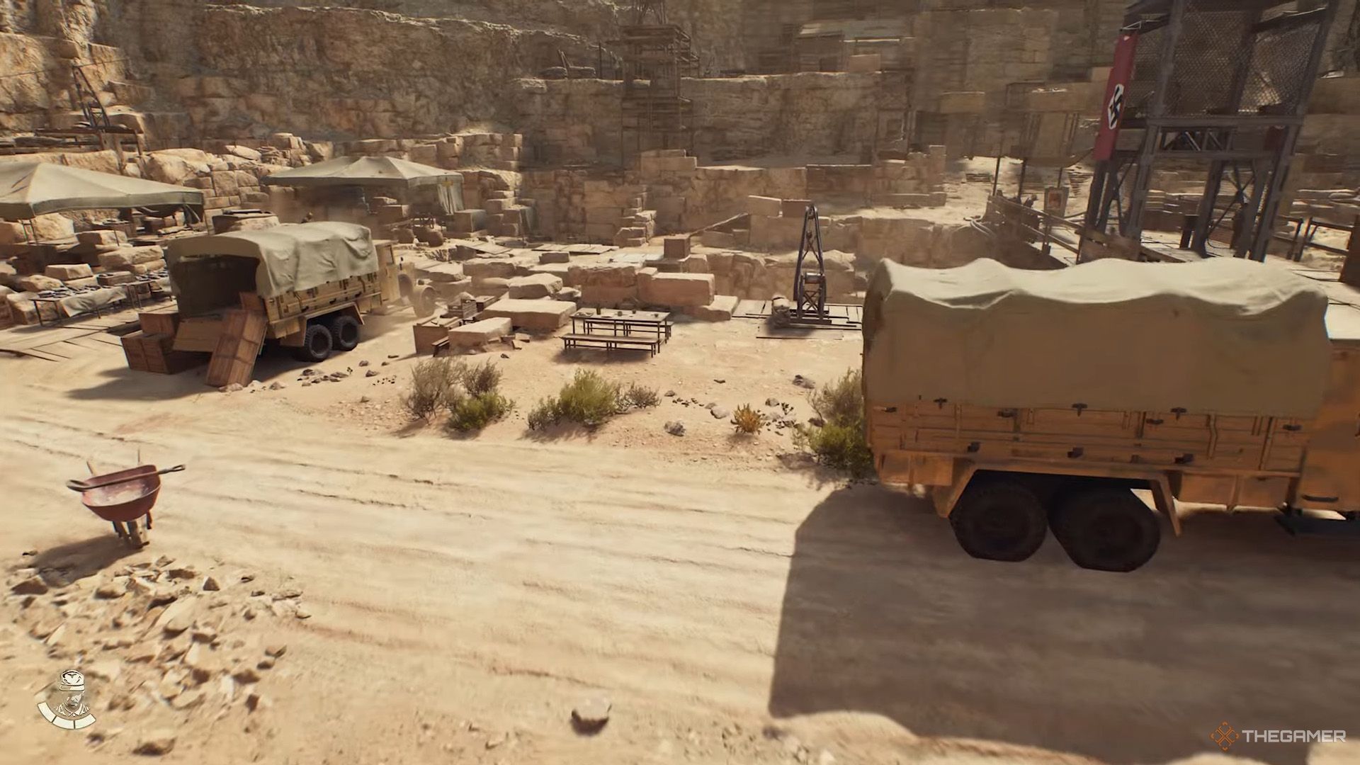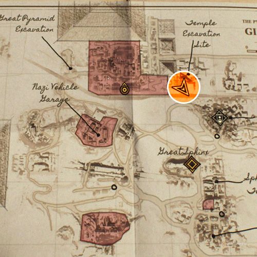 | このキーはありますギザ労働者エリアで、ナワルのテントがあります。あなたがあなたの地図を見るならば、あなたはでしょう赤くマークされたナチの軍事地域を参照してください。このエリアに入るには、Wehrmachtユニフォームの変装を使用してください。ピンボードでテントに入ります、ナチスの兵士がその前に立っています。内部の小さな丸いテーブルには、幽霊の墓キーがありますそして、出没する報告。 木製の小屋で軍事エリアを出て右折します。道をたどり、分割したら左に曲がります。ここでは、お化け屋根の鍵を使用して、並んで駐車した2つの軍用車両の背後にある謎を解きます。 |