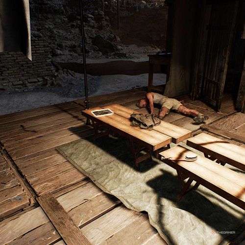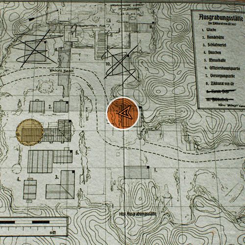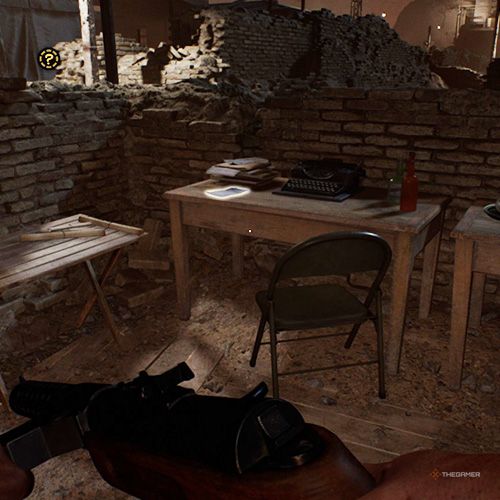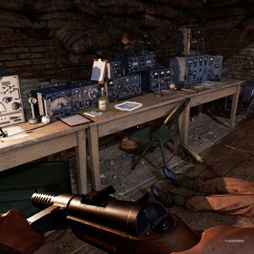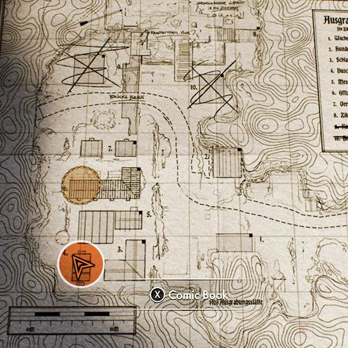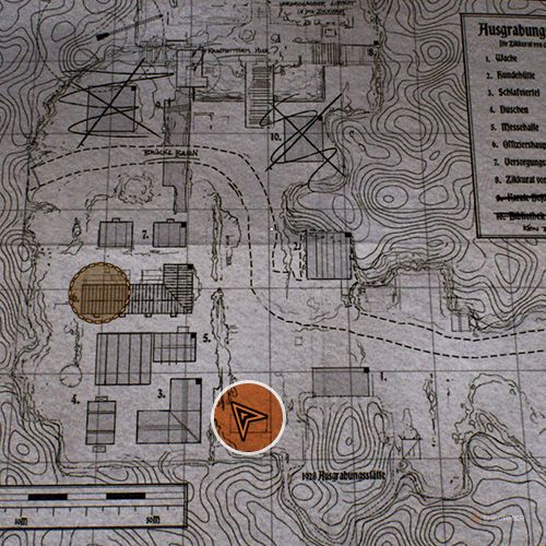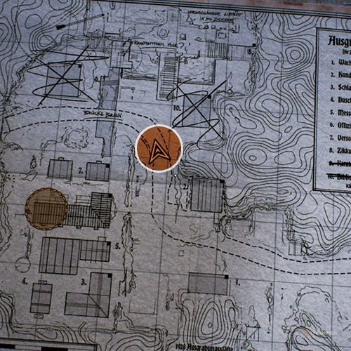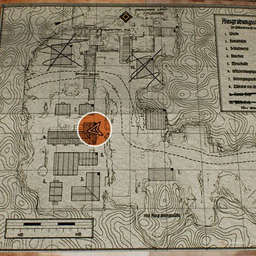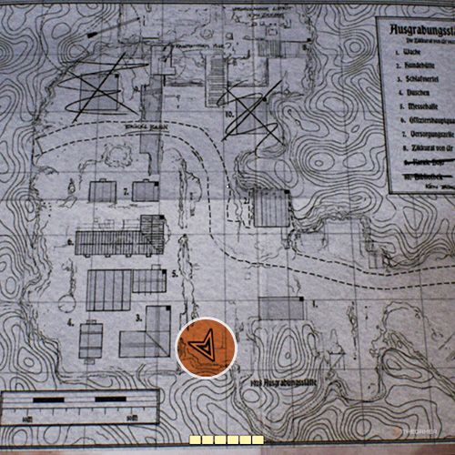 木製のプラットフォームの上を歩いた後そして、軍事エリアに到達し、まっすぐ続くと、ナチスがトレンチ間の通信装置と話しているのが見えます。彼を殺してから近くの机から地域の地図を取ります。 | ||