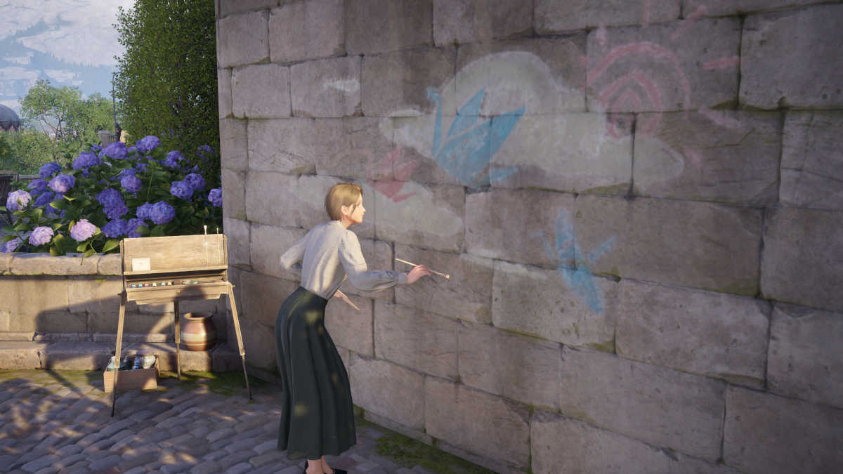 希望の木から南に行く階段の底に、壁に落書きを描いている女性が見つかります。