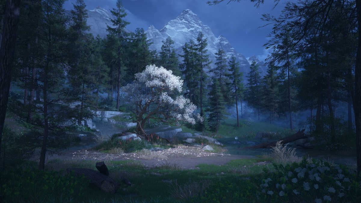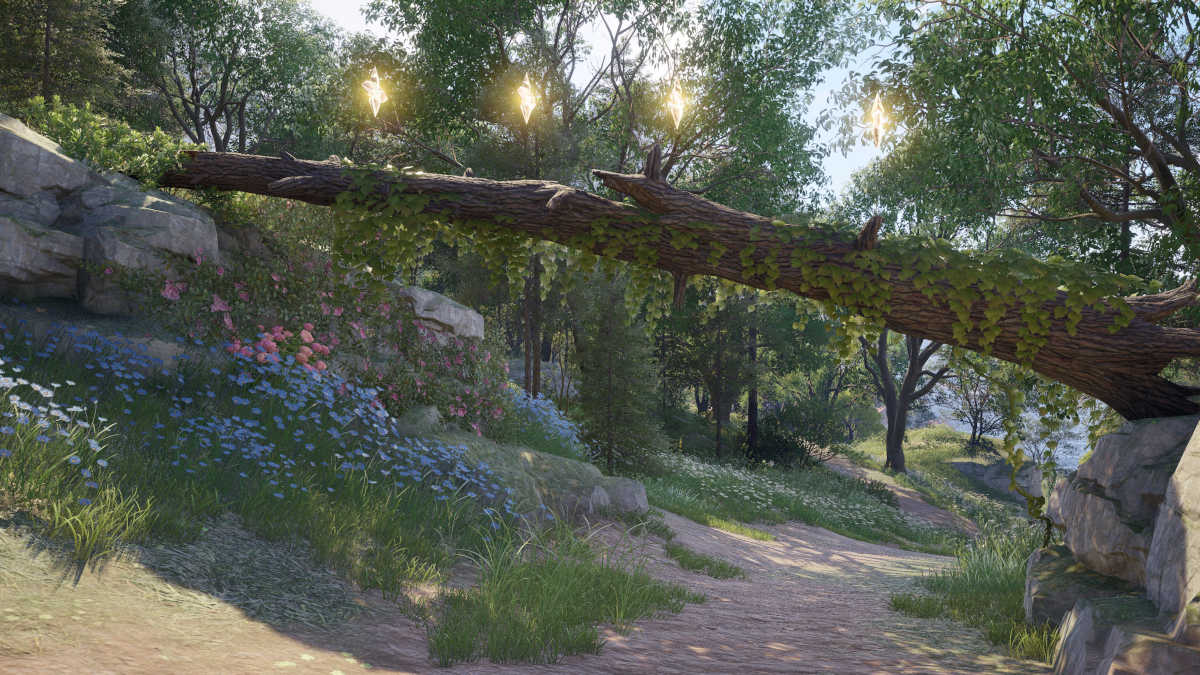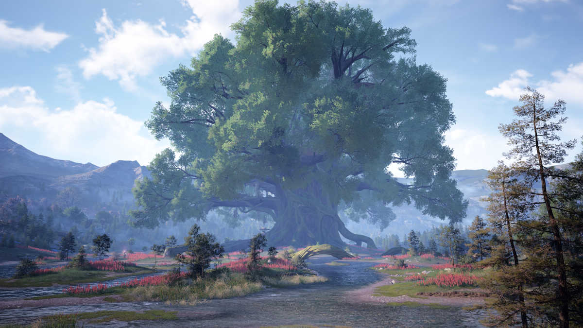 木の天蓋の下からショットを手に入れたら、西に向かい、浅瀬スロープワープスパイアのすぐ北に立ち、木自体のショットを取得します。