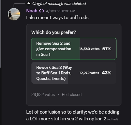 最後ですが、おそらく、プレーヤーが抱えている最大の問題は、第二海がアップデートというよりも(フィッシュの)新しいゲームを始めるようなものだと感じたということでした。第二海の新しいロッド既存のロッドのリスキンのように感じられ、新しいエリアはそれほど面白くなく、レベルキャップの増加(1,000から2,500から2,500から)のように感じましたが、最も重要なことに、ゲームは多くの人によると楽しんでいませんでした。開発者は、ゲームを改善するのではなく、新たなスタートを望んでいるように感じました。