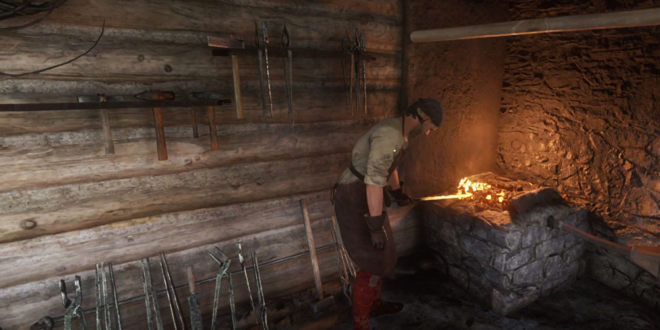 ヘンリーが物語を通して戻ってくるのを見つけるもう1つのタスクは、鍛冶屋です。ヘンリー、商人、さらには馬のために武器を作っているかどうかにかかわらず、金属を発射し、キャッチーなwhiのビートにhammerります。