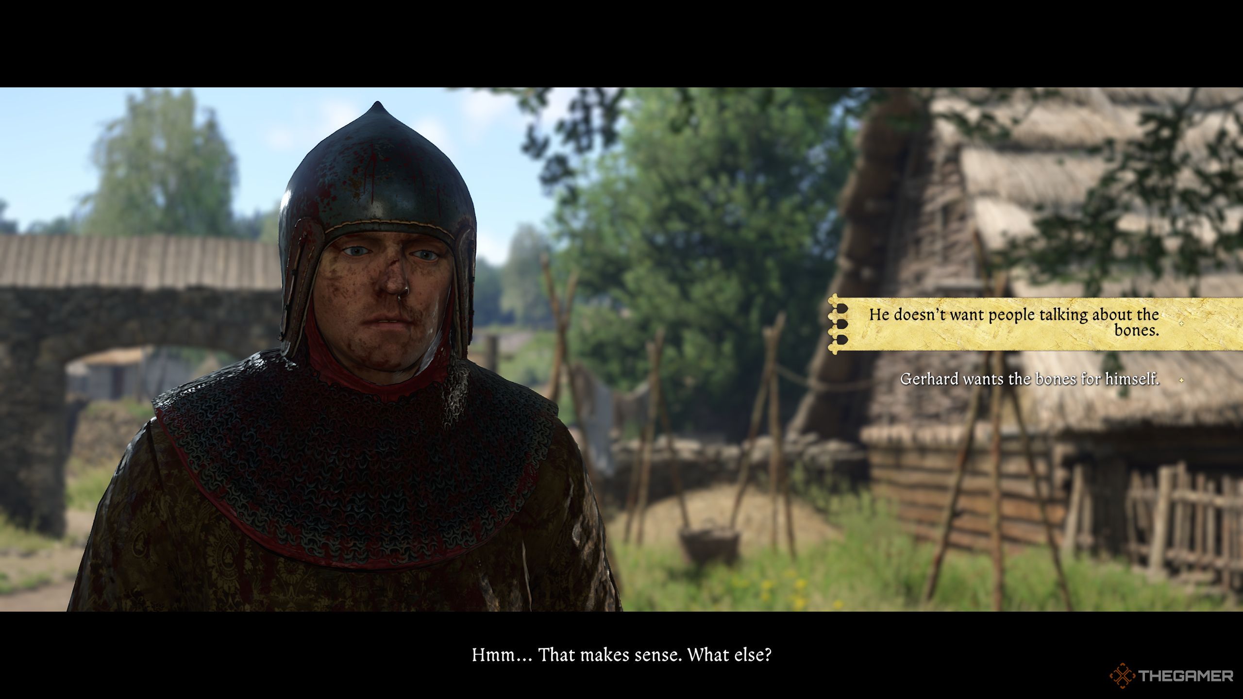 教会を出ると、ゲートのすぐ隣にあるゲルハートが外に立っていることに気付くかもしれません。彼に話しかけると、彼はかなり興味深い計画を持っているようです。ゲルハートは以前に修道院長にも意見の相違があったので、彼は骨を自分自身に保つことを目指しています。だから、彼はあなたに価格でアイテムを彼に持って行く機会を提供します。